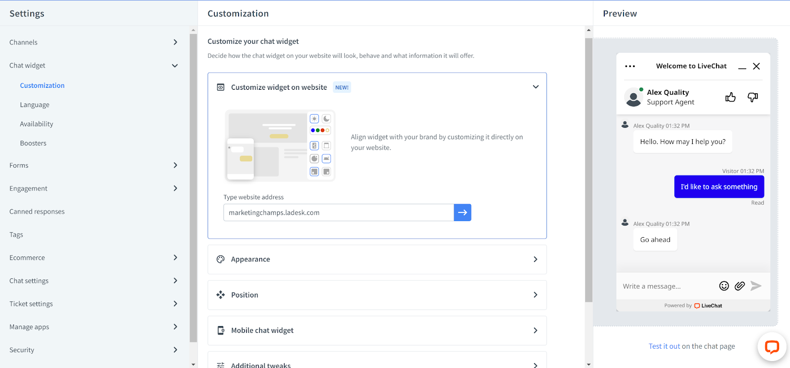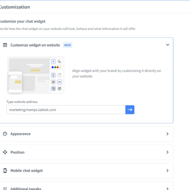 Μπορείτε να προσαρμόσετε το widget συνομιλίας σας στις ρυθμίσεις LiveChat. Οι επιλογές είναι αρκετά εκτενείς, οπότε αν θέλετε να γίνετε δημιουργικοί, μπορείτε να προσαρμόσετε το widget της ζωντανής συνομιλίας στις προτιμήσεις σας ή στην επωνυμία των πελατών σας. Οι επιλογές σας περιλαμβάνουν το πώς θα φαίνεται το παράθυρό σας σε μεγιστοποιημένη και ελαχιστοποιημένη προβολή, ανοιχτό ή σκούρο θέμα, χρώμα θέματος (υποστηρίζεται προσαρμοσμένο χρώμα) και θέση συνομιλίας. Υπάρχει επίσης η επιλογή απόκρυψης του widget, προσαρμογής της έκδοσης για κινητά του widget συνομιλίας και πρόσθετες τροποποιήσεις όπου μπορείτε να εμφανίσετε το λογότυπο της εταιρείας, τη φωτογραφία του αντιπροσώπου, να ενεργοποιήσετε ή να απενεργοποιήσετε ήχους, να επιτρέψετε τις αξιολογήσεις συνομιλιών και μερικές ακόμη επιλογές.