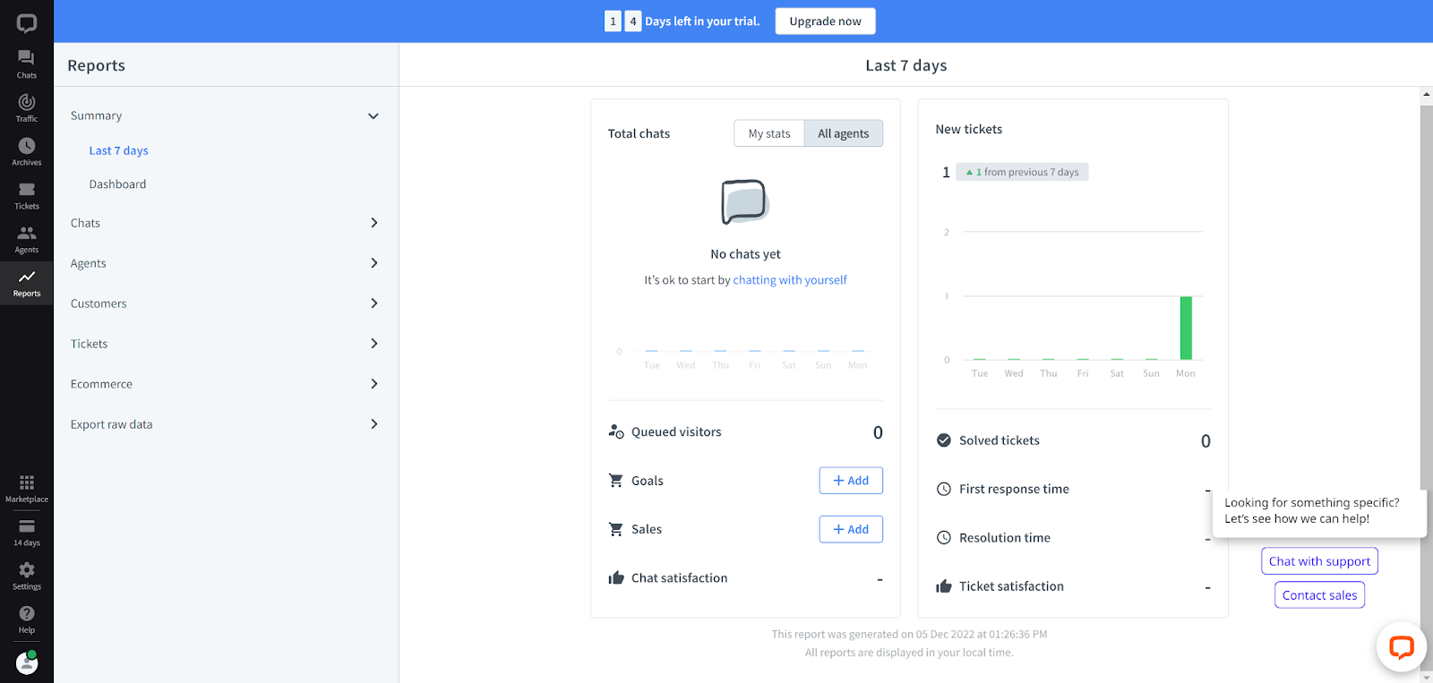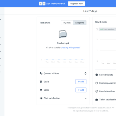Οι λειτουργίες αναλυτικών στοιχείων προσφέρουν μια γρήγορη επισκόπηση, καθώς και σε βάθος επισκόπηση όλων των όσων σχετίζονται με τη ζωντανή συνομιλία – συνομιλίες, αντιπρόσωποι, πελάτες, καρτέλες και ηλεκτρονικό εμπόριο. Κάθε ενότητα μπορεί να σας δώσει περισσότερες πληροφορίες και συγκεκριμένους αριθμούς σχετικά με τη ζωντανή συνομιλία σας. Δεν λείπει τίποτα. Η επισκόπηση αναλυτικών στοιχείων σάς παρέχει μια καταγραφή όλων όσων συνέβησαν τις τελευταίες επτά ημέρες χρήσης σας.