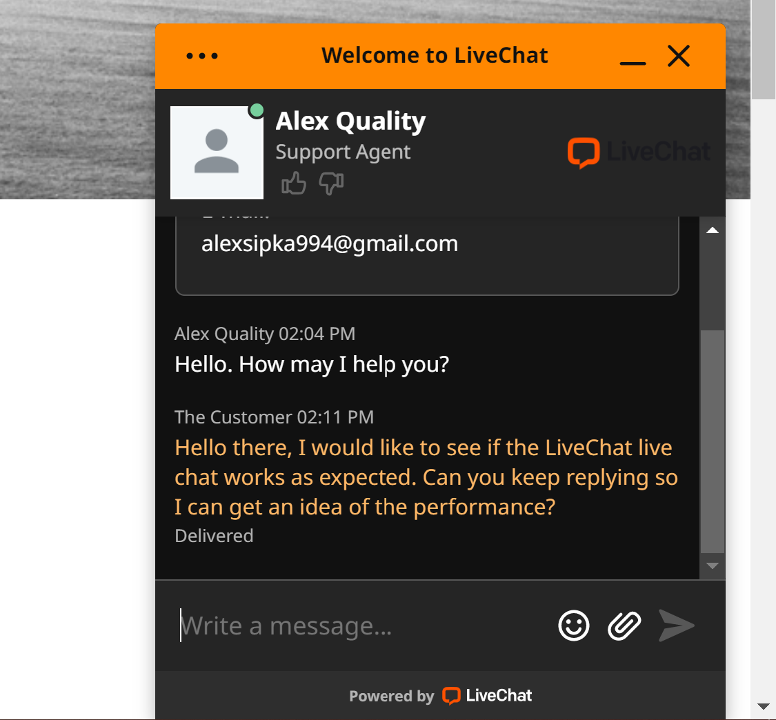Συνολικά, η απόδοση του widget ζωντανής συνομιλίας LiveChat είναι εξαιρετική και δεν έχω κανένα απολύτως παράπονο από οποιαδήποτε άποψη. Δεν αντιμετώπισα προβλήματα με την ταχύτητα και δεν υπήρχαν σφάλματα ή προβλήματα. Το widget του LiveChat είναι ισχυρότερος υποψήφιος όσον αφορά την απόδοση.