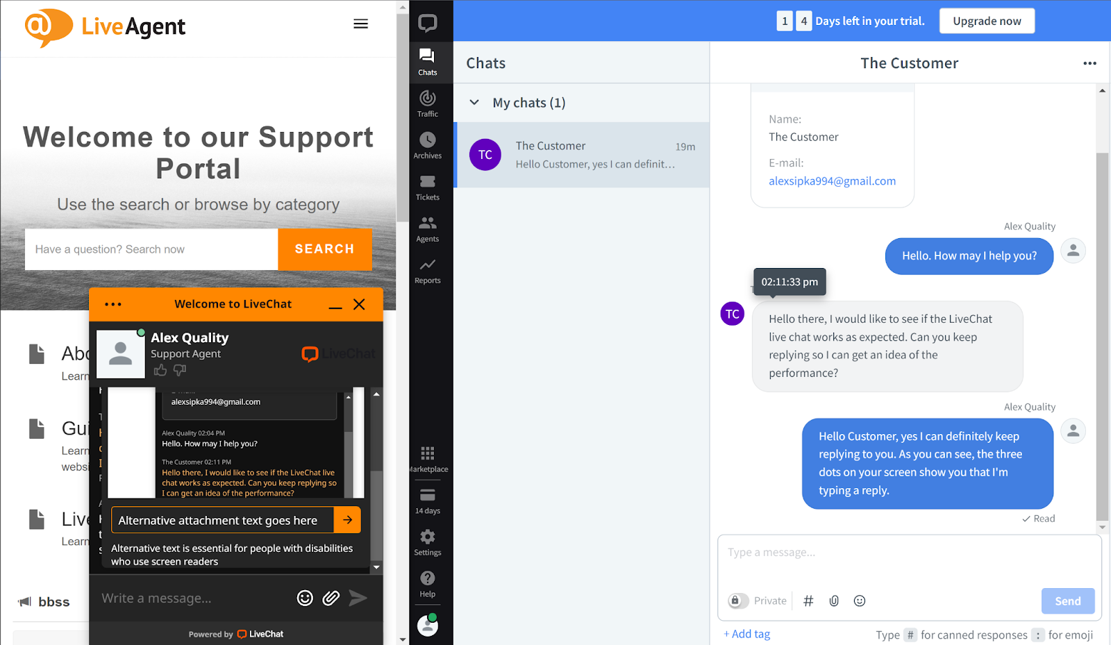 Δοκίμασα επίσης την αποστολή συνημμένων αρχείων. Όταν κάνετε κλικ στο εικονίδιο συνημμένου αρχείου, μπορείτε να επιλέξετε αμέσως ένα αρχείο και να το στείλετε. Μπορείτε να διαγράψετε το συνημμένο ανά πάσα στιγμή πριν από την αποστολή. Σε αντίθεση με την επισκόπηση του μηνύματος, οι αντιπρόσωποι δεν μπορούν να δουν ένα συνημμένο αν δεν έχει σταλεί ακόμα, επομένως το απόρρητο του πελάτη διατηρείται σε περίπτωση που επισυνάψει λάθος αρχείο. Το συνημμένο σάς δίνει ακόμη και την επιλογή να συμπεριλάβετε ένα εναλλακτικό κείμενο για άτομα με ειδικές ανάγκες. Μια πολύ αποτελεσματική και εξαιρετικά χρήσιμη λειτουργία.