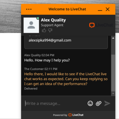 Είδα το widget ζωντανής συνομιλίας LiveChat και από τις δύο πλευρές – και από την οπτική γωνία του αντιπροσώπου και του πελάτη για να έχω την πλήρη εμπειρία και μπορώ να πω ότι όλα λειτούργησαν τέλεια, όπως αναμενόταν. Μόλις ξεκίνησα τη συνομιλία ως πελάτης και ένα αυτόματο μήνυμα με χαιρέτησε αμέσως (μπορείτε να προσαρμόσετε αυτό το μήνυμα στις ρυθμίσεις, στην περιοχή Στοχευμένα μηνύματα). Με ανοιχτό τον πίνακα ελέγχου του LiveChat, έλαβα αμέσως μια οπτική και ηχητική ειδοποίηση σχετικά με ένα νέο εισερχόμενο μήνυμα. Η καρτέλα του προγράμματος περιήγησης σας δίνει επίσης μια ειδοποίηση μέχρι να αποφασίσετε να κάνετε κλικ σε αυτήν. Μέχρι εδώ καλά.