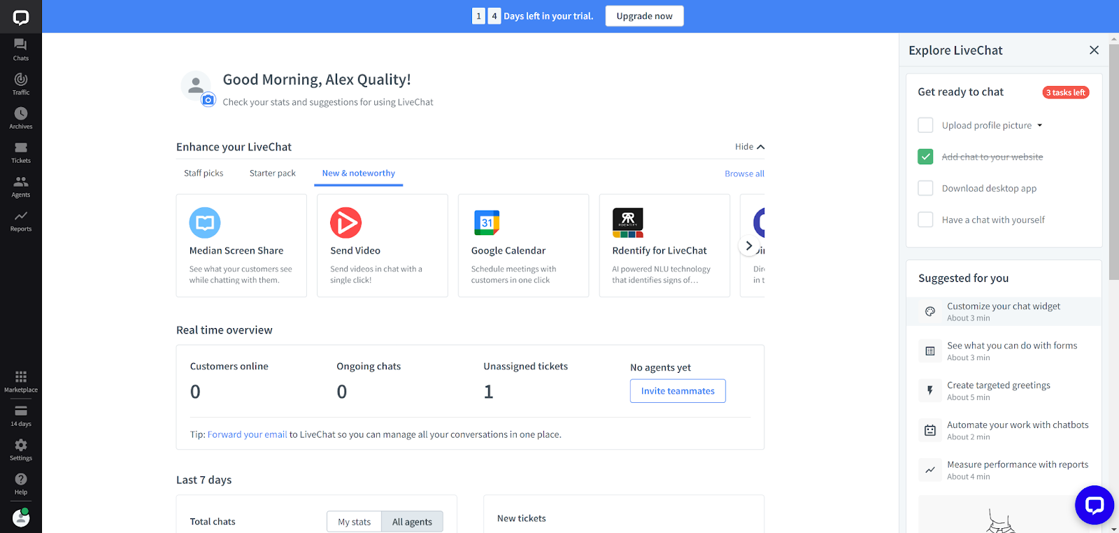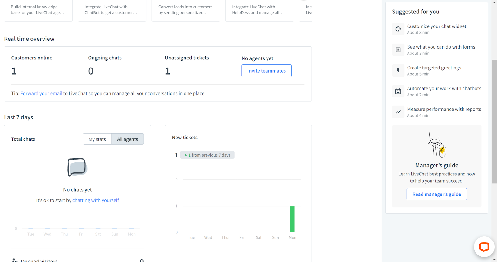 Το LiveChat είναι μια καθιερωμένη επαγγελματική λύση και η διεπαφή το ακολουθεί αυτό. Είναι εύκολο να εξοικειωθείτε με τα περισσότερα εργαλεία και δεν θα χαθείτε χάρη στις εύκολες συστάσεις στο σωστό πλαίσιο. Μπορείτε να δείτε συνομιλίες, κίνηση, καρτέλες, αρχεία, επαφές και πολλά άλλα στο μενού του αριστερού πίνακα. Το κέντρο του ταμπλό παρουσιάζει ορισμένες επιλογές βελτίωσης και μια γρήγορη επισκόπηση σε πραγματικό χρόνο των στατιστικών στοιχείων ζωντανής συνομιλίας.