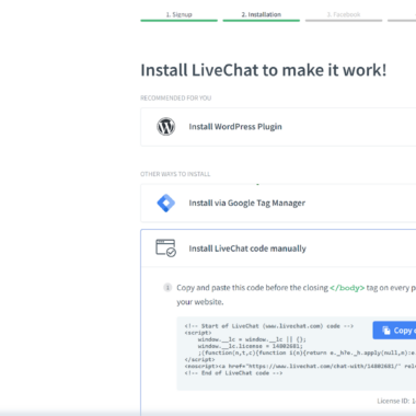 Η εγγραφή στο LiveChat είναι πολύ γρήγορη. Απλώς πρέπει να καταχωρήσετε τον λογαριασμό σας και η διαδικασία εγγραφής θα σας οδηγήσει τελικά κατευθείαν στο τμήμα ενσωμάτωσης του widget ζωντανής συνομιλίας, πράγμα που σημαίνει ότι μπορείτε να εφαρμόσετε τη ζωντανή συνομιλία σας μόλις ξεκινήσετε. Αυτό είναι εκπληκτικά γρήγορο και το LiveChat σάς προσφέρει ακόμη και μερικές επιλογές ενσωμάτωσης. Μπορείτε να επιλέξετε μεταξύ μιας προσθήκης WordPress, ενός Διαχειριστή ετικετών Google ή μιας μη αυτόματης εγκατάστασης κώδικα ζωντανής συνομιλίας.