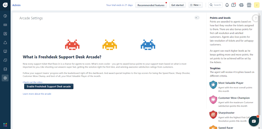 Μόλις αυτό γίνει, το επόμενο βήμα είναι να ενεργοποιήσετε το Freshdesk Support Desk Arcade στις ρυθμίσεις και να αρχίσει η πραγματική διασκέδαση.