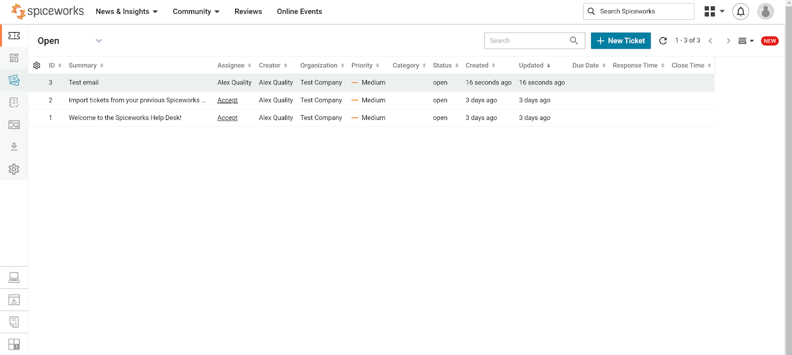 Ας ρίξουμε μια ματιά στην απόδοση του Spiceworks σε ένα τυπικό σενάριο και αν μπορεί να ανταποκριθεί σε άλλες επί πληρωμή λύσεις καρτελών πληροφορικής. Μιμήθηκα την εμπειρία του αντιπροσώπου στέλνοντας στον εαυτό μου μερικά email. Το πρώτο έφτασε σχεδόν αμέσως, αν και δεν είμαι σίγουρος πόσο συχνά ανανεώνονται οι καρτέλες του Spiceworks. Έπρεπε να κάνω κλικ στο κουμπί ανανέωσης για να εμφανιστεί το email στο σύστημα καρτελών και θα βασιζόμουν σε αυτό κατά τη διάρκεια της δοκιμής.
