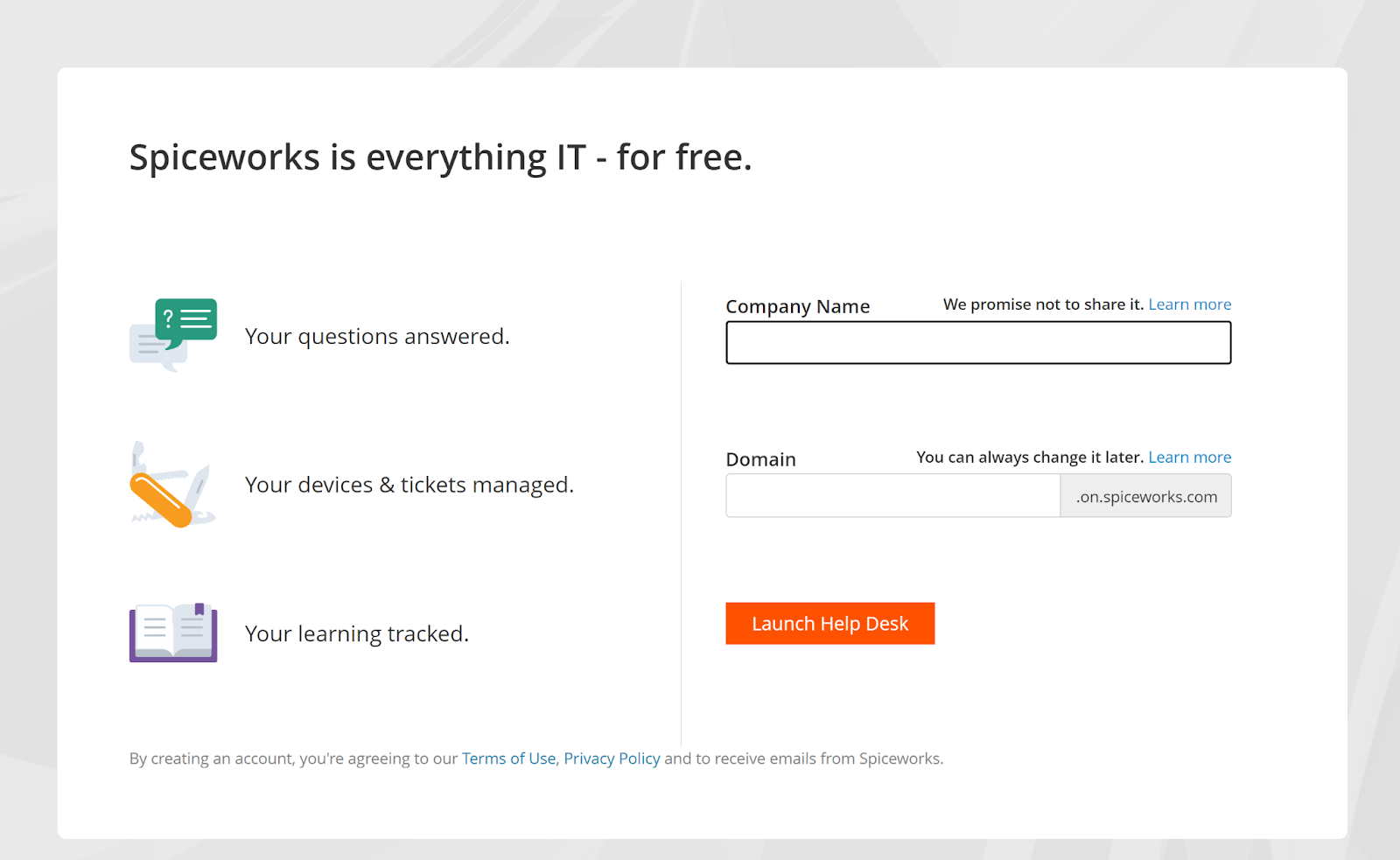 Το Spiceworks προσφέρει το κέντρο εξυπηρέτησης πληροφορικής του με σύστημα καρτελών εντελώς δωρεάν. Η ομάδα του Spiceworks συμπεριέλαβε ακόμη και μια διασκεδαστική ενότητα με προγράμματα τιμολόγησης στον ιστότοπό της. Αναφέρει τέσσερα προγράμματα με τα ίδια χαρακτηριστικά και την τιμή με ετικέτα $0. Αυτό σημαίνει ότι πρέπει μόνο να δημιουργήσετε τον δικό σας λογαριασμό στον ιστότοπο του Spiceworks και να ξεκινήσετε. Το μόνο που χρειάζεστε είναι κάποιες βασικές πληροφορίες όπως η διεύθυνση email και το όνομά σας. Μπορείτε να επιλέξετε το όνομα του domain του κέντρου εξυπηρέτησης στο επόμενο βήμα.